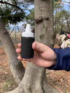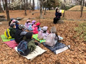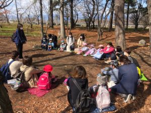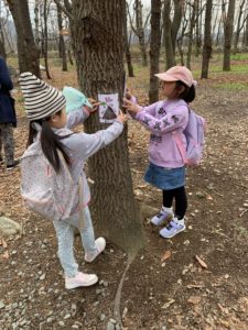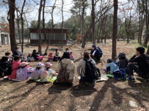 “自然の音を聞いてみよう”ということで目を瞑り…何が聞こえるか森の音を聞いてみたり、