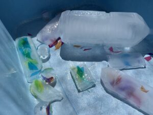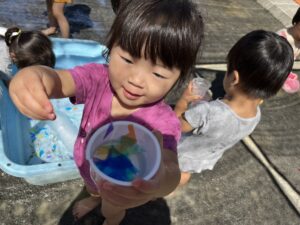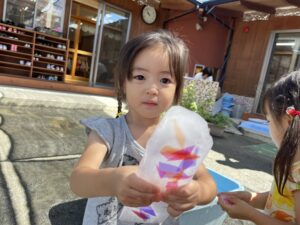 氷が溶けて中から出てきたセロファンを集めてキラキラジュースを作って楽しむ姿も見られましたよ!