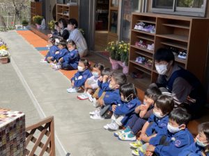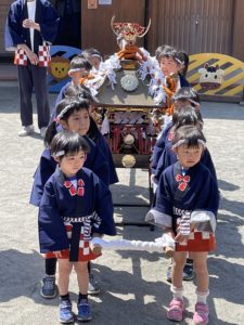 例年、町内5園が神社⛩に集まって、行われていた神輿ぶりでしたが、コロナウィルスの影響で、規模縮小でことりぐみさんが園庭でお神輿をしました😀