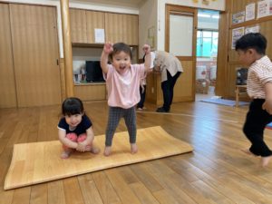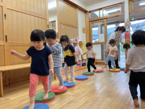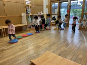 マットでゴロゴロと回転移動をしたり、一本のテープの上をはみ出さないようにそっと歩いたり、ケンパシートをジャンプで渡ったりと様々な運動を楽しみました。