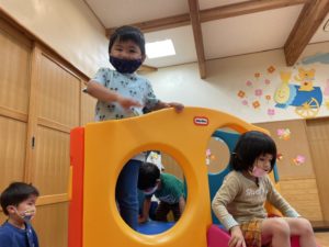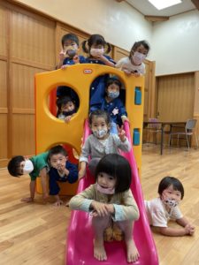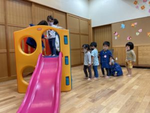 あいにくの雨でお外で遊べず、室内でカエルさんやうさぎさんになってジャンプしたりして遊んだ後に、室内用のすべり台をしました。