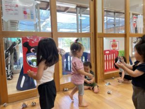 壁に貼った、アンパンマンやバイキンマンにボールを投げたりして遊びました。