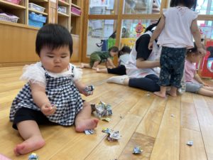 また、自分たちで紙をビリビリにして上から雨を降らせました!