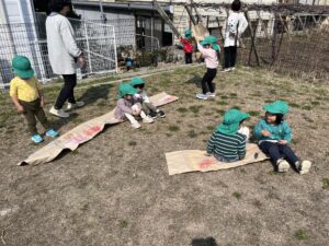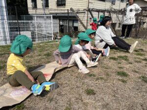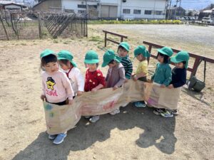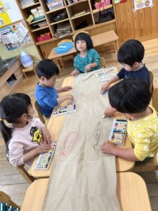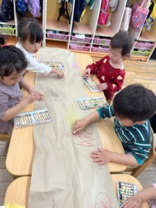 お部屋でお絵描きをした大きな紙も持っていきます!
