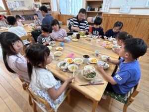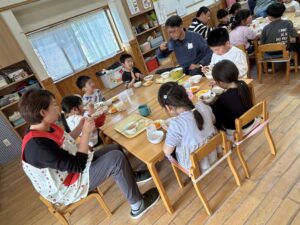 給食は園長先生、荻野先生、茂先生と一緒に