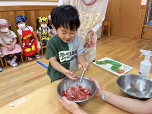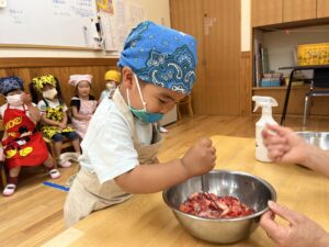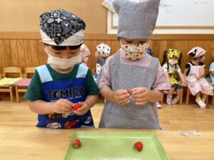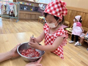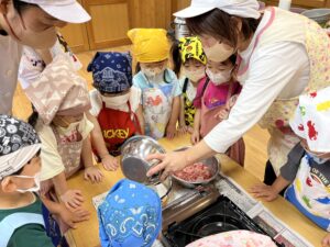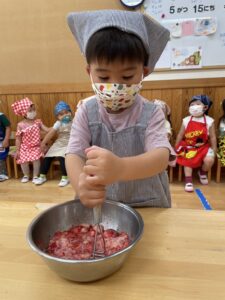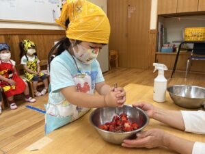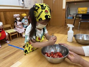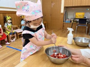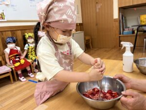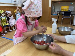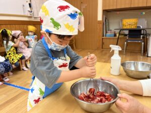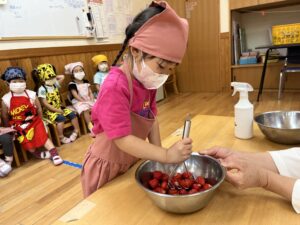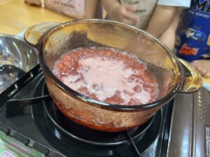 そして、みんなで準備したいちごとお砂糖をお鍋に入れてコトコト煮ます🫕