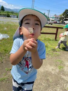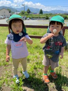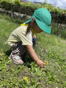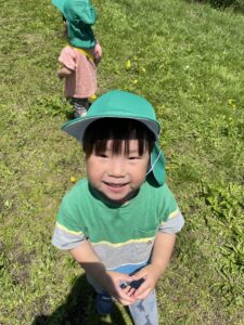 タンポポなどの草花がたくさん咲いていたので、摘んでお散歩バックに入れて遊びました。