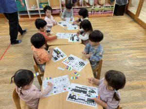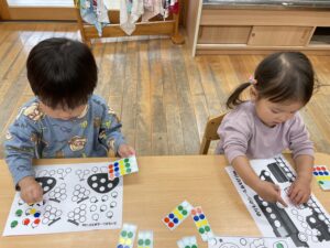 『ここかなぁ?』と悩みながらシールを一生懸命に貼っています!