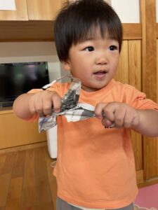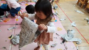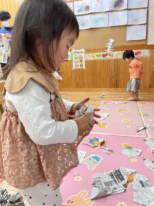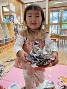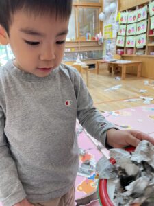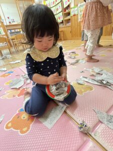 少し破いてみると新聞紙の形が変わって面白いね👏🏻✨