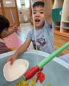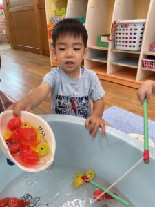 たくさん釣れたらまた水の中に戻してね!とお話ししたので、お皿の中の魚を戻してくれている所です!👏🏻✨