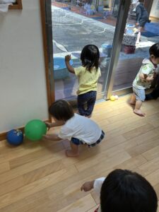 風船を「えいっ!」と投げてみたり、ボールをコロコロ転がしたりして遊びました!
