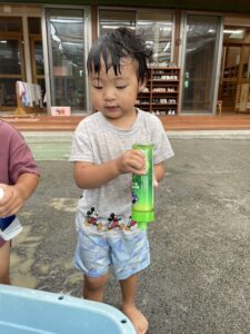 洗った洗剤ボトルを水鉄砲にして遊んだり、