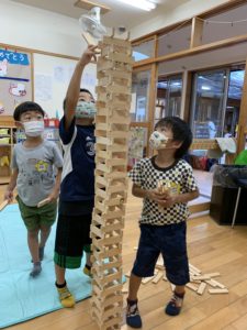 協力して積み上げた積み木の前で記念写真📸