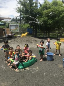 今日は水鉄砲をしました。興味津々で、水が出ると大喜びのみんなでした。暑い夏になりそうですが、たくさん水遊びをして、楽しもうね☺︎(小林)