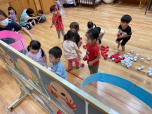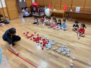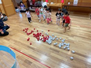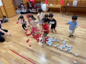 保育士の話を聞いて、よーいどん!で玉入れスタートです🚩