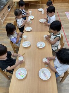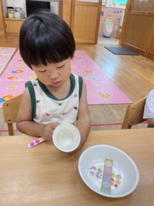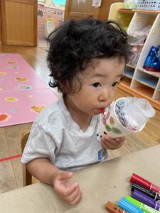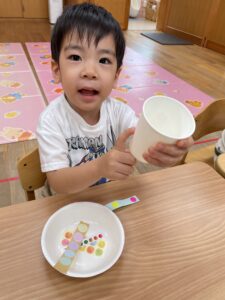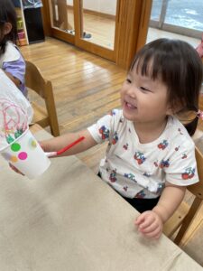 紙コップに貼ったシールが顔のようになると『みてみて!』と見せてくれました☺️