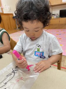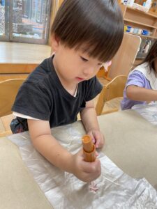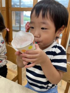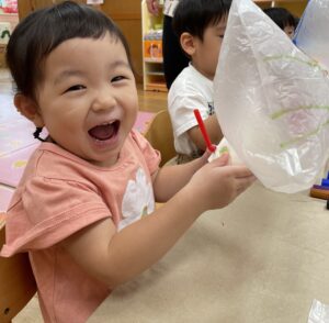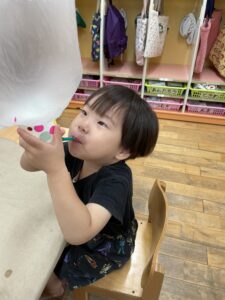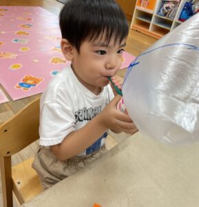 初めは吹くのが少し難しく苦戦していましたが何度か挑戦するうちにコツを覚え、楽しむ姿が見られました✨『みててね!』とお友達同士で仲良く見せ合う姿にほっこりしました💕(新海)