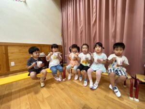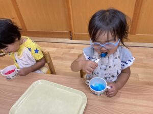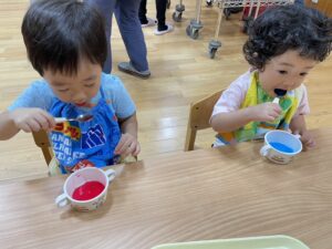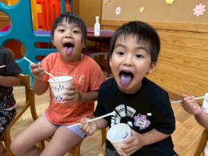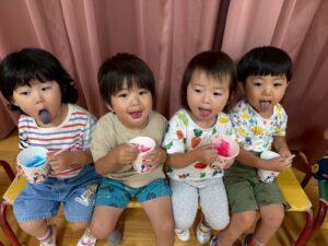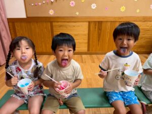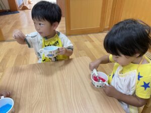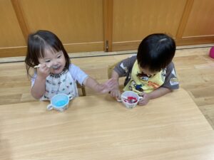 2歳児さんと以上児さんがお遊戯室で一緒に夏の風物詩🍧かき氷🍧を食べました😋