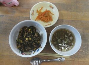 給食には沖縄県の学校給食で人気があり、全国1位の収穫量である「もずく」を使った『もずく丼』や『人参しりしり』を出しました✨