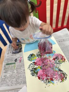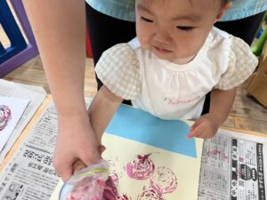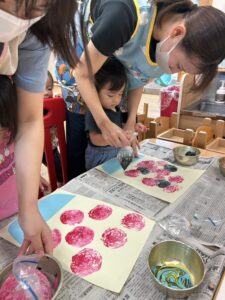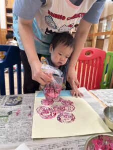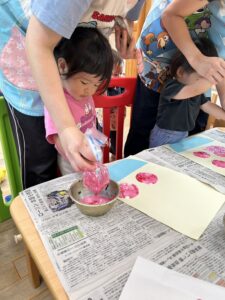 袋越しに手に伝わってくる水の冷たさや、スタンプを押す度に沈み込む不思議な感触など、これまでやってきたスタンプとは一味違った、夏にぴったりな水の感触を楽しみながらの製作でした!