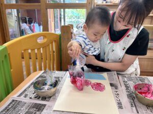 少し前になりますが、🐰0.1歳児クラスでは夏の製作をしました🍨