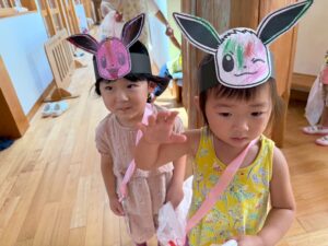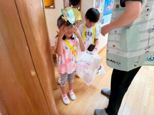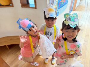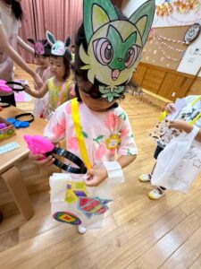 手作りお面をつけて、お買い物バックを持っていざお買い物です🛍️