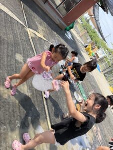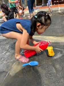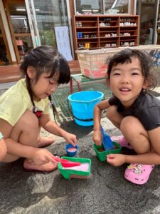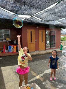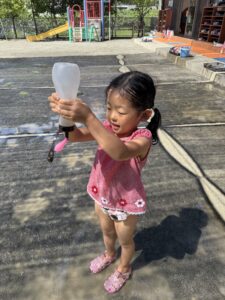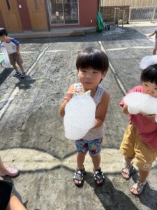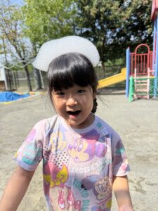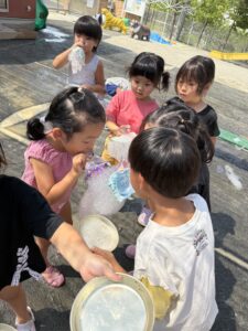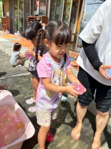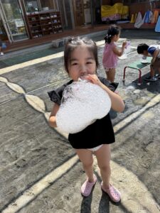 色水遊び、水風船、シャボン玉、泡遊びに氷遊び….水に関する遊びがこんなにもたくさんあり、毎日お友だちとなにをして遊ぶのか意見を出し合いながら楽しく遊んでいました!