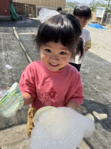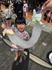 お友だちとシャボン玉を拭きあいながーーーい泡を作っていると、周りからも「一緒にやりたい!」とやってきて、たくさんのお友だちとつながっていました!🫧
