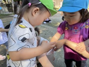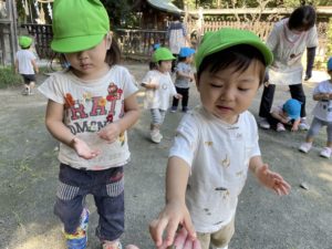 拾ったどんぐりを、保育者に「みてー」と渡してくれました💕