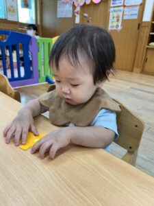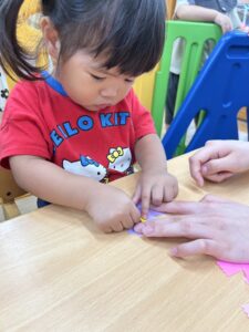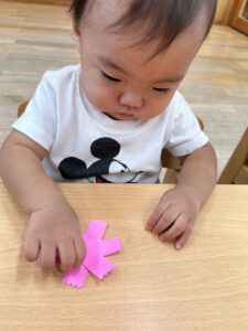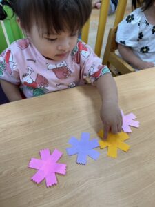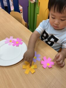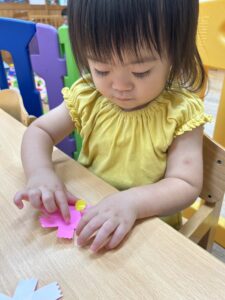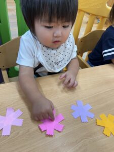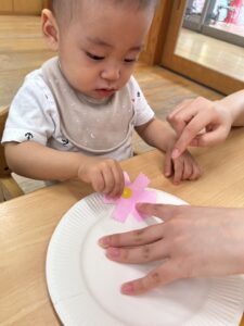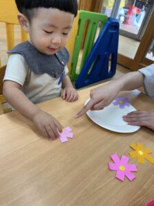 お花に貼れるかな?頑張れ〜!