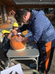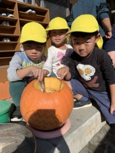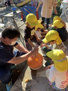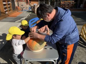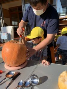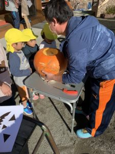 最後にカボチャの顔を園長先生と一緒にくり抜いて…