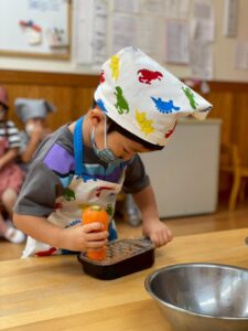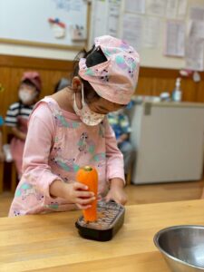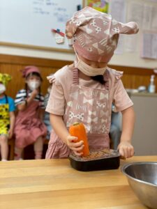 次に、おやつのドーナツに入れるにんじんをすりおろしましたよ☺️手をすりおろさないようによーく見ながらすりおろします!
