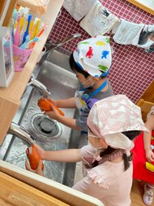 両手で優しくにんじんを持ってきれいに洗いました!!