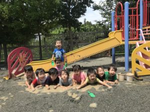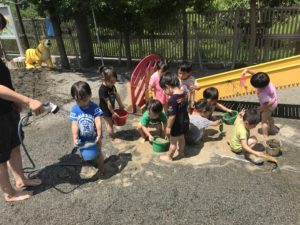 お天気がよかったので泥んこ遊びをしました。バケツに水と砂を入れ混ぜ混ぜしたり、水たまりの中に入って水の冷たさを体験したりと、ひとりひとり、楽しんでいました!