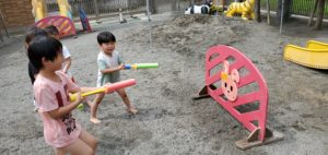 今日は湿度が高くじめじめしていましたが、水遊びで気分もリフレッシュできました。皆でビショビショになって遊び、笑顔が絶えない時間となりました。