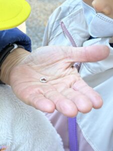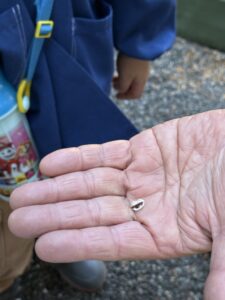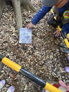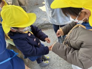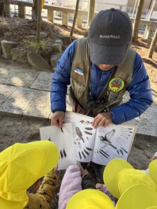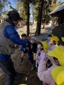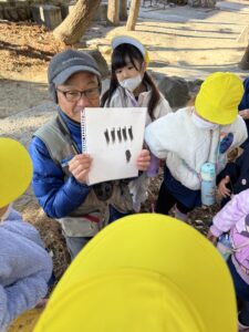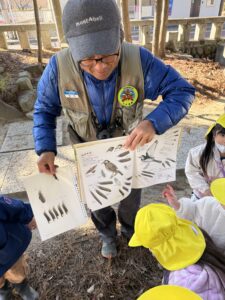 松の近くには鳥の羽が落ちていました!みんなで図鑑を見ながら調べていくと「ムクドリ」の羽でした!