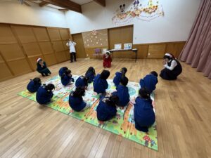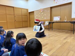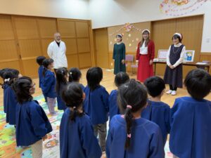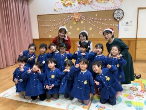 3人の先生たちの帽子や服装に気付き、「サンタさんみたい!」「クリスマスだからかな?」とワクワクするほしぐみさん⭐️