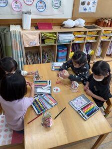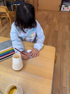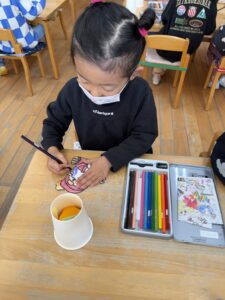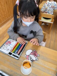 塗り終わったサンタさんを紙コップに貼り空いているところに好きな絵を書いています!