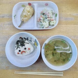 給食は「おにご飯、金棒つくね、大豆のサラダ、みそ汁」です🧌