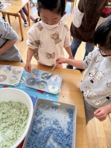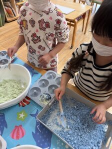 重曹とクエン酸を混ぜて、食紅で色をつけました💙