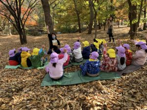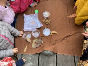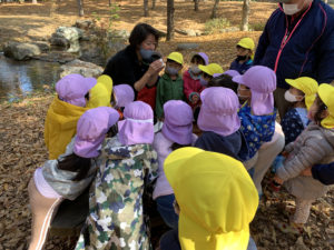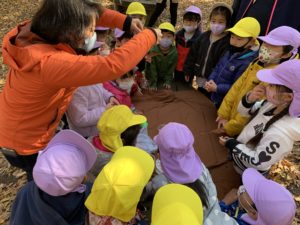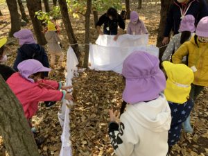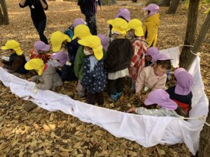 その後は『もりのおふろ』という絵本を読んでもらい、落ち葉のおふろを実際にみんなで作りました🛁