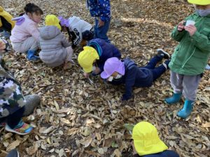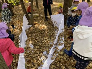 その後は『もりのおふろ』という絵本を読んでもらい、落ち葉のおふろを実際にみんなで作りました🛁