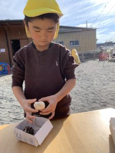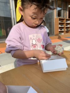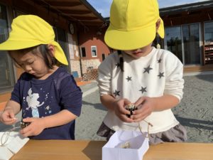 インタープリターさんがバードケーキ(牛脂・ナッツ・小麦粉を混ぜて固めた物)をくださり、子どもたちが松ぼっくりにつける作業をしました🐥✨