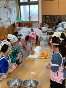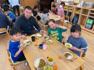 さっきの⭕️❌クイズ大会で勝ち抜いた4人に、園長先生と事務長先生を呼びに行ってもらい、待ちに待った一緒の給食の時間!