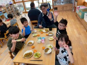さっきの⭕️❌クイズ大会で勝ち抜いた4人に、園長先生と事務長先生を呼びに行ってもらい、待ちに待った一緒の給食の時間!