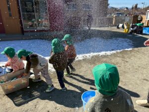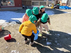バケツに雪をかき集めるとみんなに