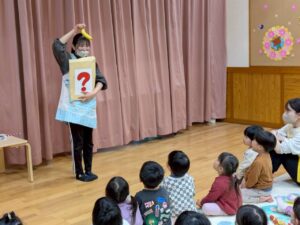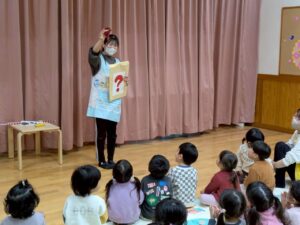 先生がお誕生日のお友達にまつわるクイズを出すと、たくさんのお友達が手を挙げて答えてくれました!