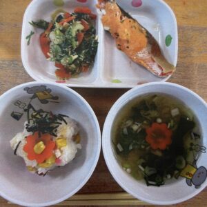 メニューは「ちらし寿司、鮭の春色ソースかけ、白菜のおかか和え、すまし汁」です🏵️