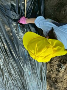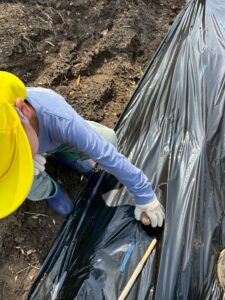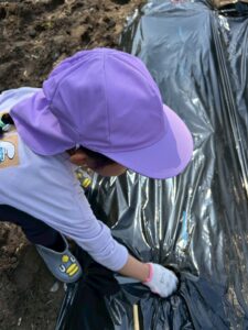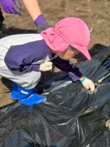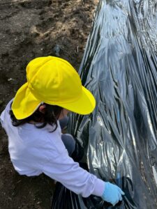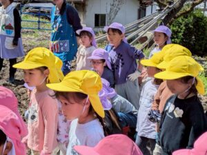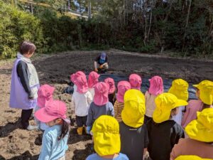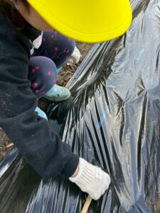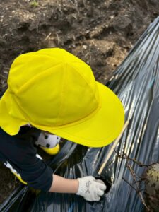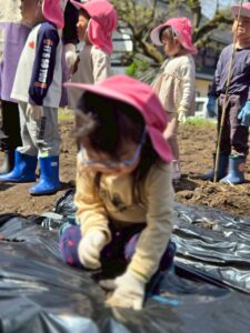 畑に着くと軍手をはめて…、初めてのもも組さんは四苦八苦‼️