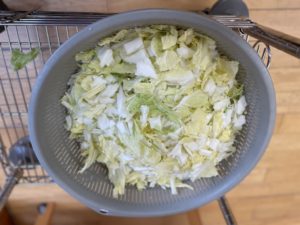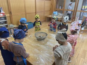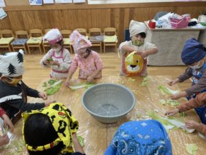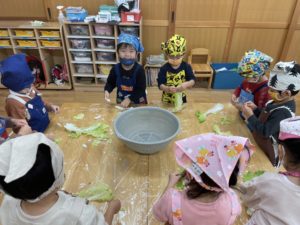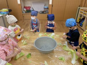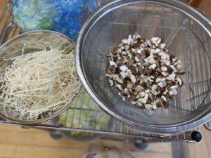 麺はことり組さんが、にんじんと大根はほし組さんが、もも組さんは白菜としいたけとえのきを千切りました!
